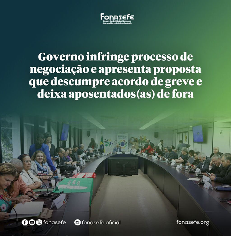 O Fonasefe repudia o posicionamento do governo, tendo em vista que a proposta apresentada representa um rompimento com os diversos acordos de greve, que previam a isonomia dos benefícios com os demais poderes. Assim como, a exclusão dos aposentados nas propostas apresentadas.Exigimos, ainda, que o auxílio-saúde não seja vinculado à comprovação de gastos de saúde com operadoras específicas. Orientamos às bases das entidades que considerem a discussão de uma eventual contraproposta na pauta estabelecida.