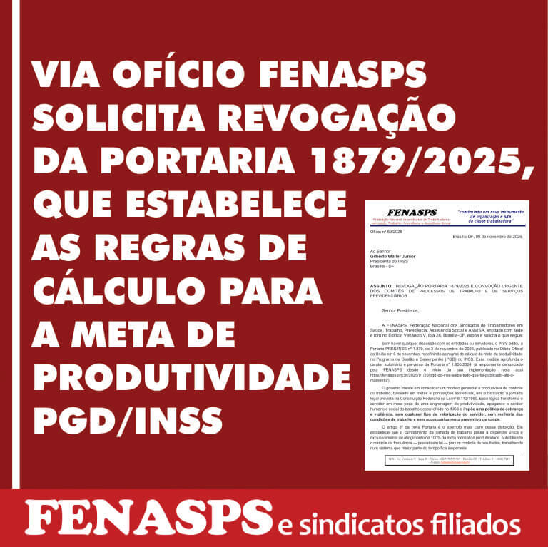 A Fenasps encaminhou ofício ao presidente do INSS requerendo a revogação da portaria 1879, que aprofunda ataques aos servidores do Seguro Social, demonstrando que as ações desta gestão estão totalmente desconectadas da realidade da categoria, que sofre assédio moral institucional, vem adoecendo, e não consegue cumprir suas obrigações e as metas absurdas, porque o sistema esta maior parte do tempo inoperante. Os servidores do INSS estão sofrendo as consequências do caos vivido no Instituto e, portanto, é urgente que a direção convoque os comitês que discutem estas questões, bem como cobrar do Ministro para regulamentar o Comite Gestor para terá a tarefa de tratar das demandas da categoria.