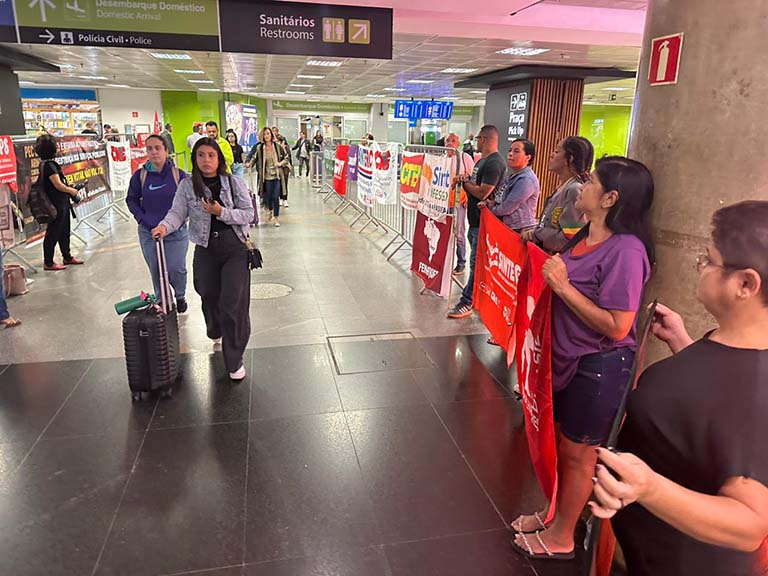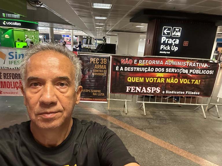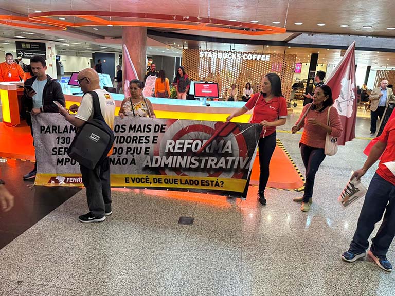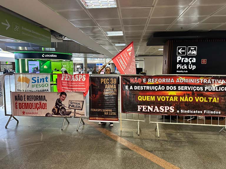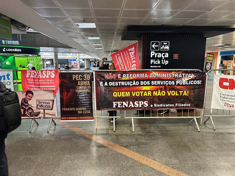 A FENASPS participou nesta terça-feira (11/11) de mais um ato nacional no Aeroporto de Brasília, reafirmando a luta contra a reforma administrativa — a PEC 38, que representa um ataque frontal aos direitos do funcionalismo público e aos serviços prestados à população.