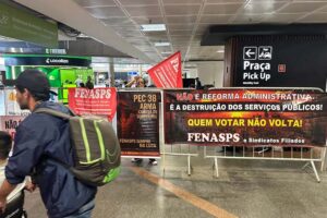 A FENASPS participou nesta terça-feira (11/11) de mais um ato nacional no Aeroporto de Brasília, reafirmando a luta contra a reforma administrativa — a PEC 38, que representa um ataque frontal aos direitos do funcionalismo público e aos serviços prestados à população. As mobilizações entram agora em um novo patamar de enfrentamento: é hora de ...